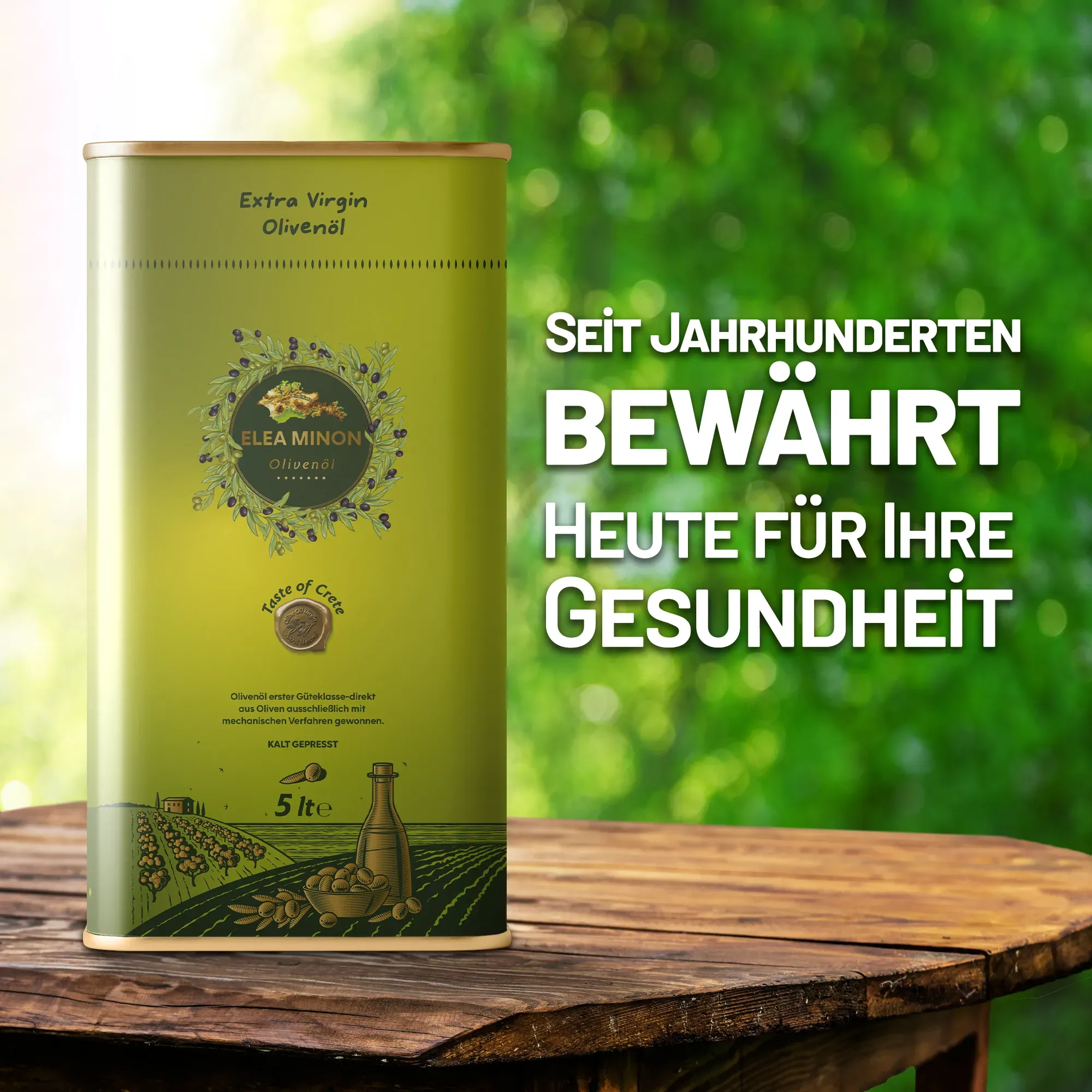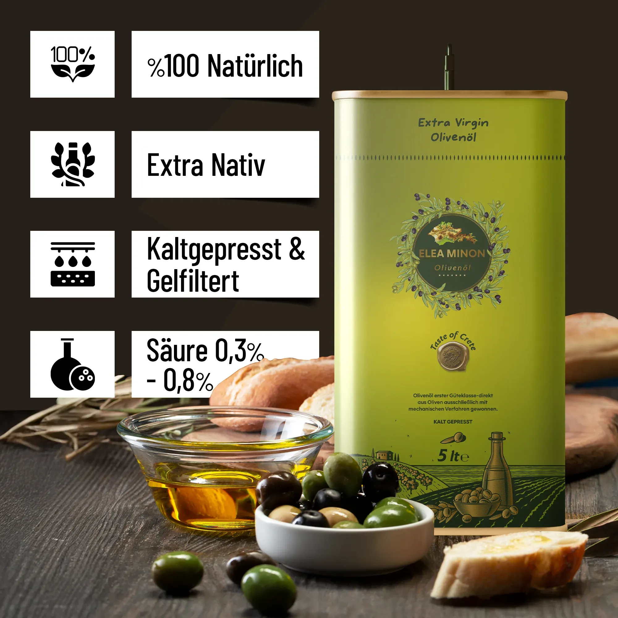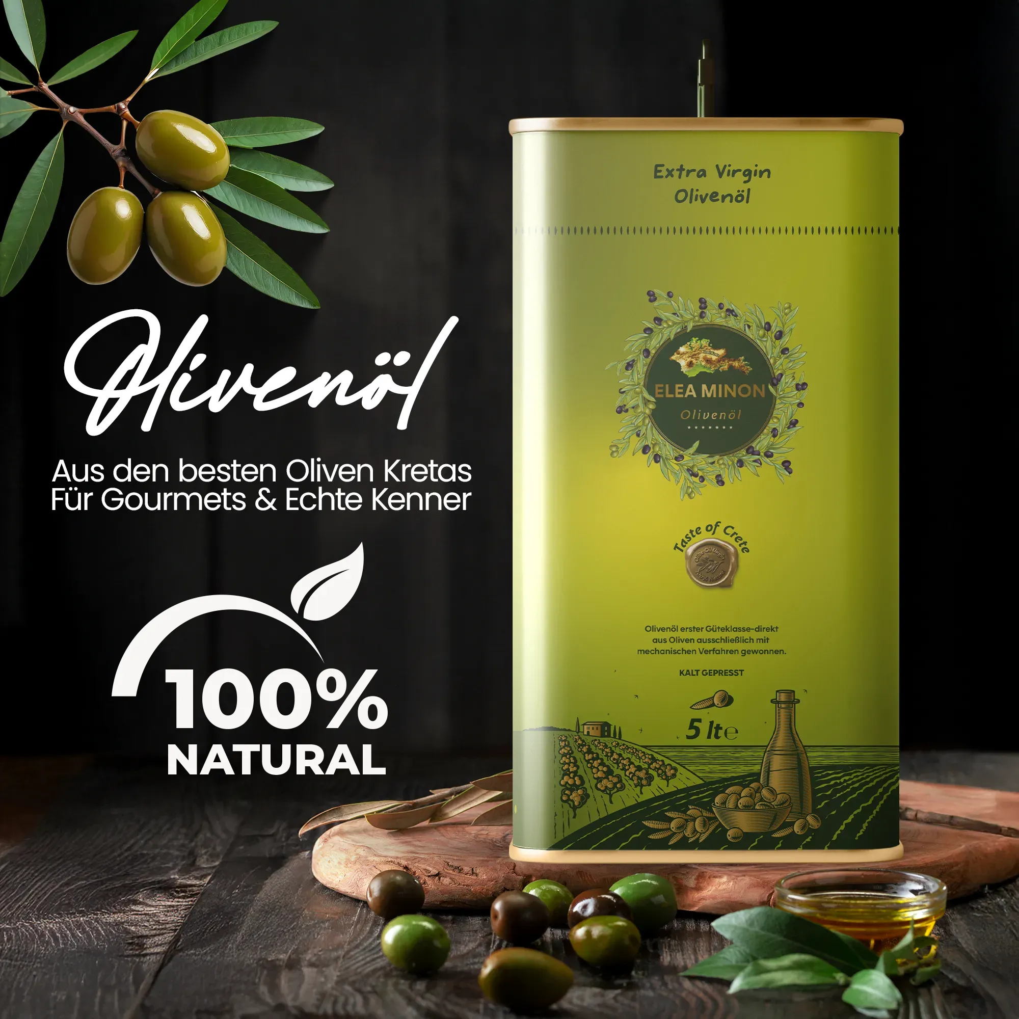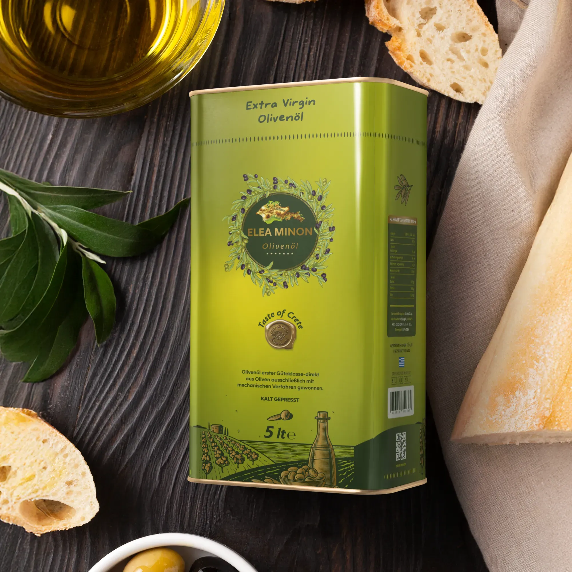 Unser Produkt, das Elea Minon Olivenöl 4x5L, ist ein hochwertiges, natürliches Olivenöl aus den jahrhundertealten Hainen Kretas und wird mit größter Sorgfalt in unserem Familienbetrieb produziert.